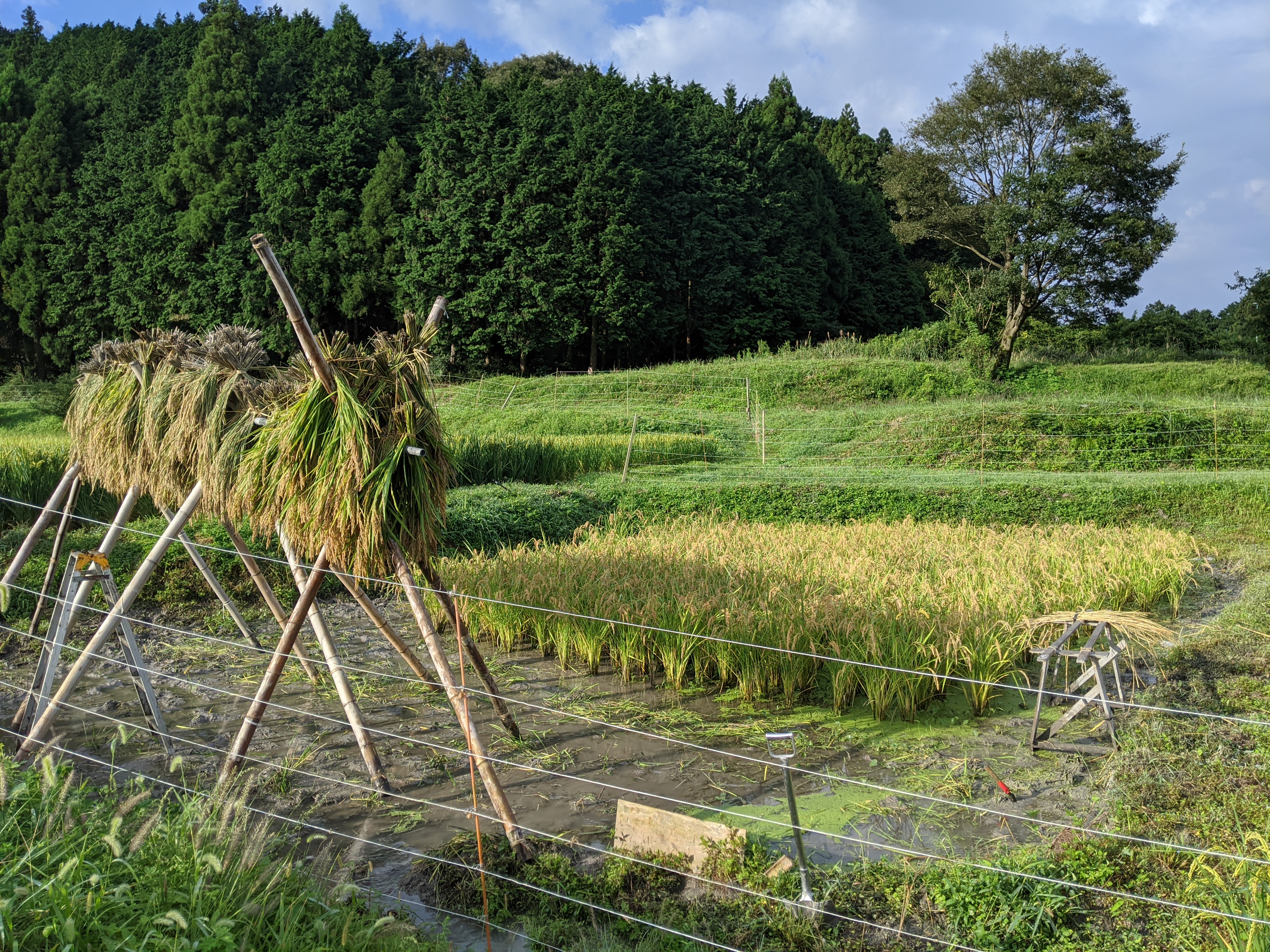 雨対策 稲架掛けした稲にブルーシート。しかし丈足らず
